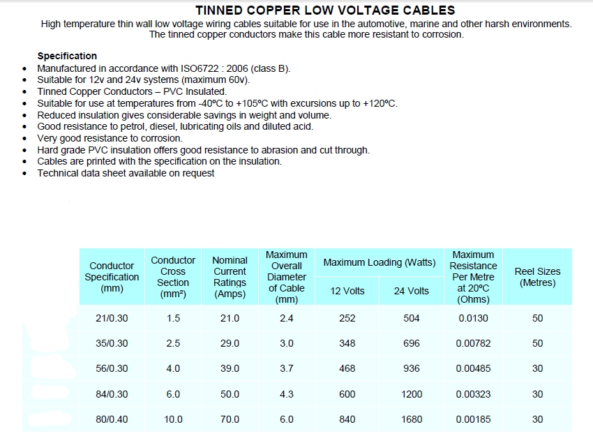 Ce câble est très similaire à câble à paroi mince sauf que les conducteurs en cuivre étamé sont, en les rendant plus adaptés pour la marine et d'autres environnements corrosifs. Câble détails sont donnés dans les boîtes bleues ci-dessous. Par exemple, 010901, a 21 brins de fil de cuivre de diamètre 0,3 mm étamé (21/0.3), ce qui donne une section transversale totale de 1,5mm², d'une capacité de 21 ampères et son diamètre dont l'isolation est 2,4mm.